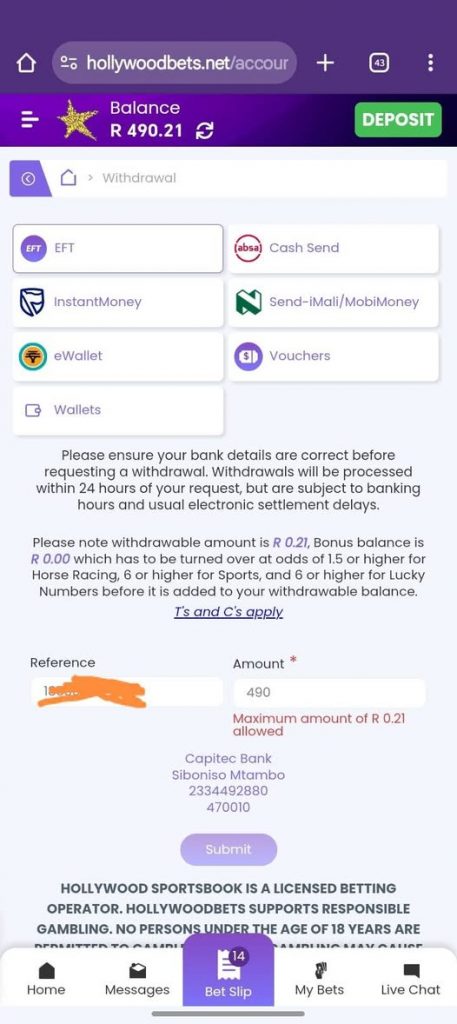 Hollywoodbets EFT Withdrawal Limits