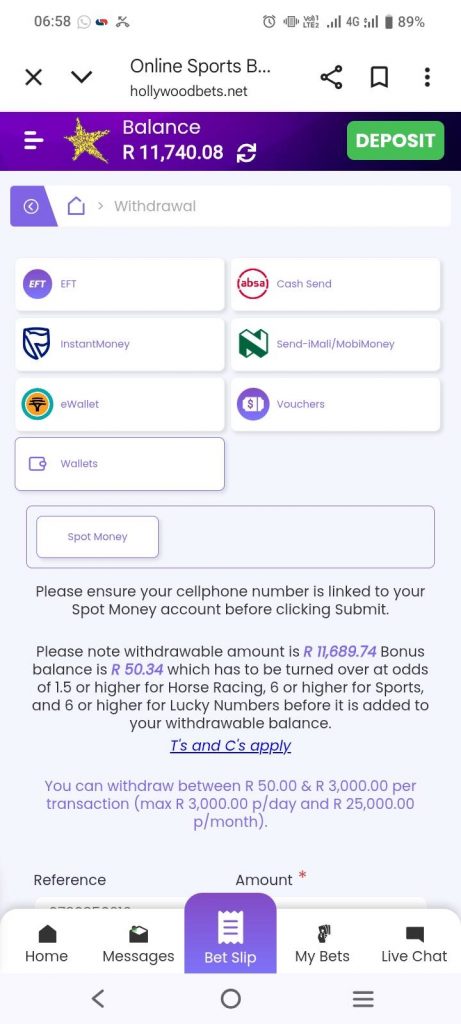 In-store withdrawalImmediateHollywoodbets branchesID document