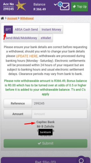 Withdrawing via EFT is a reliable option for sending winnings directly to your bank account. It’s ideal for larger amounts and for users who prefer a traditional banking transfer.