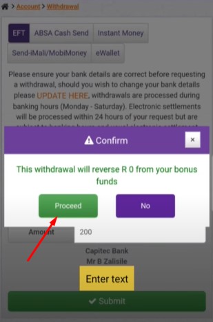 - Choose Your Preferred Method: You will be presented with a list of available withdrawal methods, such as EFT (Bank Transfer), ABSA Cash Send, FNB eWallet, and others. Select the one that works best for you.
