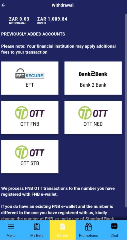 The most popular withdrawal method among South African players is the traditional EFT option. This banking method works with all major South African banks including: